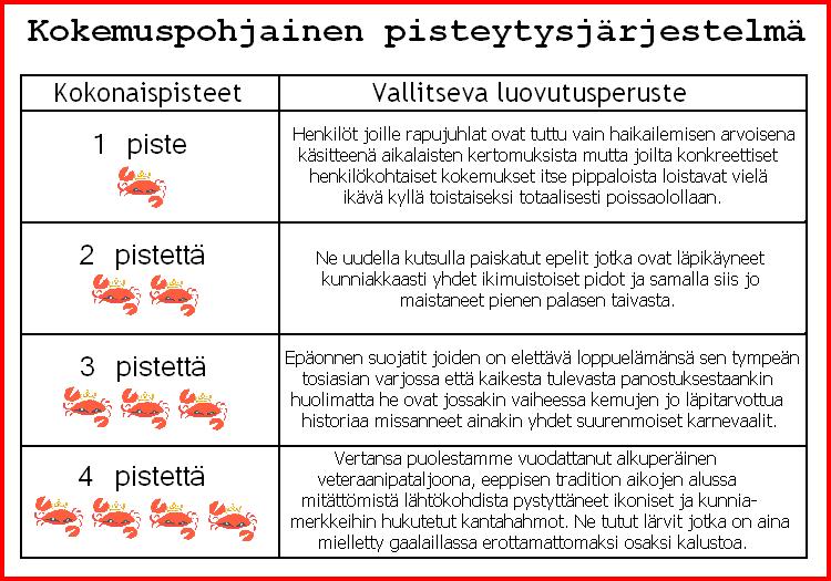 Mutta sitten pidemmittä lätinöittä ja jankkauksitta itse fantastisen ja taatusti käänteentekevän uudistuksen kimppuun. Toimikunnan hurmaava peluripoppoo onnistui siinä nimittäin taas kerran: he tarrasivat kaksin käsin alunperin nyt enää historiankirjojen sivuilla komeilevan komitean luomaan vallitsevaan traditioon ja muokkasivat siitä hillittömän nerokkailla tyylikeinoilla jotakin täysin tuoretta ja mielenkiintoista, säilyttäen toki samalla varman ja hyväksi koetun peruskonseptin mitään tärkeää poistamatta tai turhaa kehiin lisäämättä ja ennen kaikkea muuttamatta pienimmänkään olennaiseksi miellettävän yksityiskohdan etukäteen tarkkaan puitua sijoituspistettä. Kiinnostavaa tämänvuotisissa teemavaaleissa on upouusi, kokeneen rapujuhlijan puolella oleva moderni pisteytysjärjestelmä. Kuningasidea rullaa kaikessa lyhykäisyydessään seuraavanlaista rataa pitkin: kaikilla äänioikeutetuilla on käytettävissä yksi ns. "vakioääni" mutta jokaisista bileistä, johon kyseinen henkilö on aiemmin jo ennättänyt ottamaan osaa, napsahtaa lisäksi yksi valintaa komppaava samanarvoinen kokemuspiste. Tiedämme kyllä, kuinka osa teistä uudemmista jäsenistämme juuri tällä hetkellä kiukuttelee närkästyneenä nyrkkiään tietokonetuoliensa käsinojiin tuskissaan takoen: nakertaako tasa-arvoisuuden puoltamisella tänä vuonna ratsastava toimikunta nyt irrationaalisesti itseltään päätä irti? Voidaanko sanoa, että tässä vohkitaan lopultakin se viimeinenkin tukeva perusta pois koko vaalit alunperin alulle siittäneestä kauniista ja kannustettavasta käsitteestä, josta jo muinoin käytettiin nimeä demokratia?