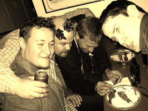 Lopuksi tahtoisimme vielä heittää ilmoille sen saman jokavuotisen muistutuksen, jonka moni vanha vieraamme osaa toki jo pätevästi ulkomuististakin ja kehotamme kaikkia paikalle ilmaantuvia kaljasieppoja nappamaan mukaansa riittävän määrän mieluisimmaksi katsomiaan alkoholipitoisia virvoitusjuomia. Jos sammumaton janosi yllättää jopa sinut ja tajuat kitalakesi olevan karhea vielä senkin jälkeen, kun olet jo imutellut hanakasti sekä omat että vierustoverisi viinakset, totta kai voit äärimmäisessä hätätapauksessa kääntyä päättäväisessä mielentilassa järjestysmiehen puoleen, jolla ehkä saattaa olla sinulle plakkarissa sääliolut tai parhaassa tapauksessa kaksikin, mutta älä nojaudu liikaa siihen mahdollisuuteen - jos kokemuksen kartuttamiin juomatottumuksiisi kuuluu esimerkiksi oksentaminen hyvän humalan päälle, baaristamme saattaa valitettavasti loppua drinksut kesken ennen kuin ylevä missiosi on yltänyt tavoittelemisen arvoiseen finaaliinsa saakka. On eittämättä järkevintä toimia näin: laskelmoi etukäteen kuinka paljon alkoholia yhden illan aikana tulet luultavasti tissuttelemaan ja nappaa mukaasi vielä vähän saamasi yhteenlaskun lopputulosta enemmän tuota syntistä nestemäistä kultaa - rapujuhlissa kun itsensä ja omien odotustensa ylittäminen on se määränpää, johon kaikki jollakin lailla aina tuppaavat päätymään. Paskaako tässä enää kummempia joutavuuksia, näihin kuviin ja tunnelmiin, länsi on tuota pikaa meidän! Long hard night it's gonna be.