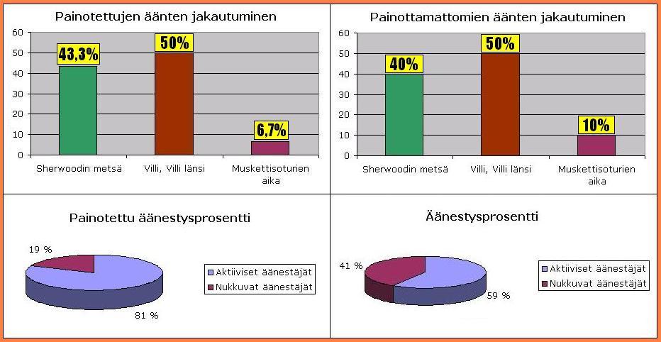 Kovertaessamme lopputulokset suurennuslasin alle voimme selkeästi havainnoida, että ylittämätön Villi, Villi länsi rohmusi annetuista äänistä minkäänlaisia lupia keneltäkään kyselemättä tasan 50%, Sherwoodin poppoon jäädessä nipin napin amerikkalaisten alapuolelle silti todella näyttävällä 43,3% äänisaalilla. Kilpakumppaneista kolmannen, Muskettisoturien ajan, kohdalla erot ylivoimaiseksi osoittautuneisiin haastajiin näyttäytyvätkin jo sitten huomattavasti selvemmän oloisina - Pariisin porukan surkuteltavaksi kohtaloksi kun jäi säälittävän peränpitäjän rooli, tässä taistossa aika tyhjänä kumisevan mitäänsanomattomalla 6,7% tuloksella. Ranskalaisia ei voinut missään vaiheessa kokea heti vilkkaan etumatkan kuroneelle kaksikolle todellisena vakavasti otettavana uhkatekijänä, vaikka se sinällään tietenkin aivan teoreettinen skenaario, jossa myös kaikilla vielä antamattomilla äänillä soturit todellakin olisivat konkreettisen voittonsa voineet periaatteessa lunastaa, pysyi valloillaan pöllästyttävän kauan - lähes loppufanfaareihin saakka. Etukäteen runsain mitoin julkista kohua synnyttäneiden kokemuspisteiden vaikutus vaalien nyt nähtävään lopulliseen tulokseen olikin sitten huomattavasti odotettua vaatimattomampi, hektisellä ensivilkaisulla esimerkiksi oheiset pylväsdiagrammit saattavat näyttää, noh, aika helvetin samanlaisilta, joku voisi niitä jopa vikkelästi kurkattuna identtisinä lähestyä. Esimerkiksi 1800-lukulainen western-nostalgia olisi napannut tismalleen saman prosenttiosan äänistä myös vanhan mallin mukaista laskutapaa seuratessa: 50%, ei enempää saati hitustakaan vähempää ja ihan hyvä näin - ainakin tunkkaisten saluunoiden sänkisten kantisten hyvinvoivan ulkokuoren kannalta.