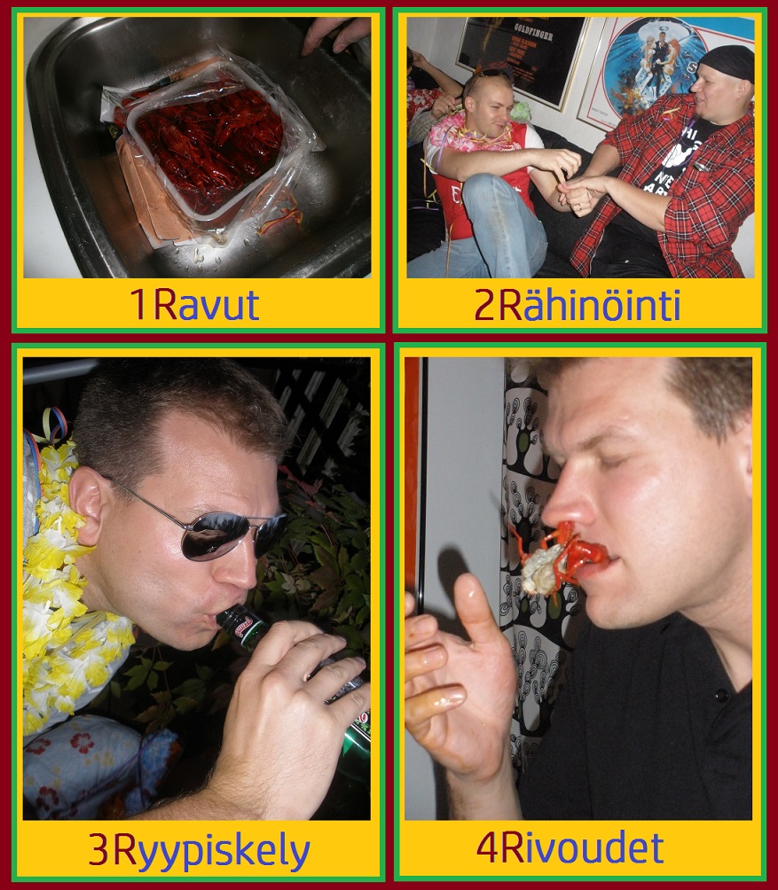 Ajauduttuamme äkkiarvaamatta ja kuin vaivihkaa näiden vääjäämättömien perimmäisten kysymysten kiusalliseen keskipisteeseen, saatoimme vain harmaat aivosolut kelmeästi sauhuten aprikoida, olemmeko valmiita johdattelemaan kahdeksannelle vuodelleen ketterästi loikkaavan ihastuttavan instituution askeleen lähemmäs kinkereiden todellisia alkuperäisiä juuria, palauttaen näppärästi päheät pippalot niille turvallisille ja luottokelpoisille perustuksille, joille koko messevä komeus loppuen lopuksi noina vallankumouksellisina aikoina urhoollisten uudisraivaajien toimesta valettiinkin? Vohkivatko tenhoavat mutta tökerön päälleliimatut ylimääräiset sirkushuvit kuitenkin tähdellistä huomiotamme tuosta pyhästä 4R-filosofiasta eli niistä moitteettoman merkityksellisistä seikoista, jotka on aina harrastajien piirissä mielletty rapujuhlien tiimellyksessä eittämättä kaikkein olennaisimmiksi ja keskeisimmiksi tekijöiksi muhkean menestysreseptin pitkäikäisyyden ja lumovoiman takana (Ravut, Rähinöinti, Ryypiskely, Rivoudet)?